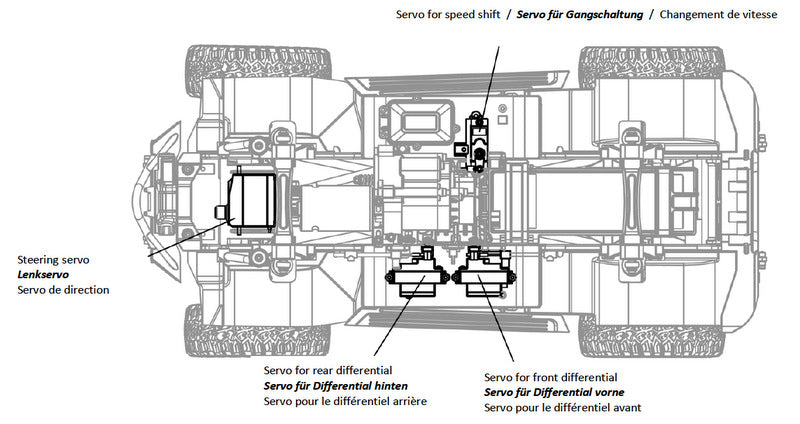 Lock and unlock the front and rear differential independently to get the maximum performance on the track - all controlled remotly from your tranmitter and 2x 0,9kg mini servos. Leave the differential unlocked for a smooth hadling at high speed. On tecnical trails you can lock the front differential, the rear differential or even both to handle extreme terrain.