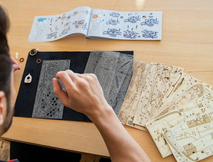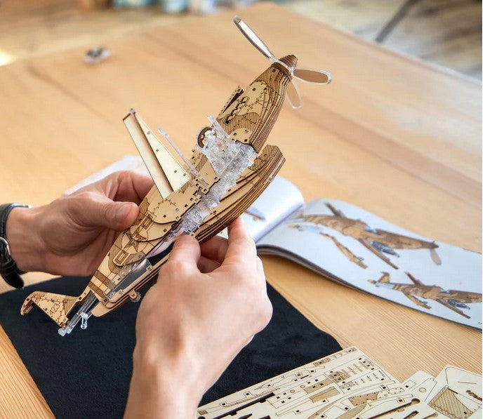 This 3D mechanical wood and plastic puzzle is a DIY functional model that features a working engine, functional ailerons, diving rudder, and yaw control. Driven by a flat metal spring, the model accelerates up to 1 meter and features retractable landing gear for an even more realistic look.