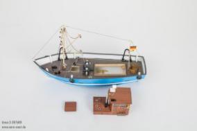 The scale of 1:20 offers a spacious vacuum formed ABS hull. The kit comes with laser-cut wood parts and a wooden deck that has all the planks and details engraved. The parts for the wheelhouse are made from mahogany plywood, the window panes are laser-cut as well and fit the openings perfectly. Masten and booms are aluminium.