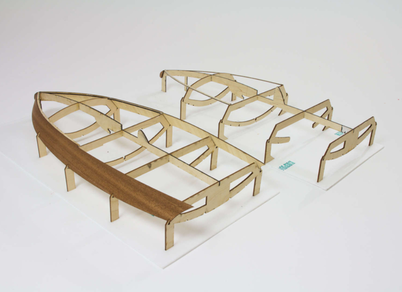 The Spitfire is a model of an Outboard Racing Boat. Like the full-size vessel, our 1 : 5.2 scale model is of all-wood construction. All the mahogany and birch plywood parts are laser-cut, and the hull is quickly assembled on the building jig supplied in the kit. The kit contains all the wooden parts, fittings, covering and jig, plus etched German silver components.