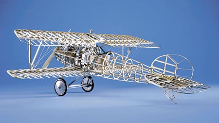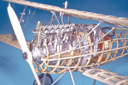 The most interesting feature of the Model Airways Albatros kit is its open airframe. Normally hidden under layers of cloth or canvas, we leave the laser-cut wooden frames uncovered to show the intricacies of construction. You’ll find birch fuselage bulkheads, wing ribs and pilot’s seat, basswood fuselage stringers and wing rib caps. Cockpit is reproduced in authentic detail, complete with tachometer, pressure gauge and compass. An authentic 180 HP Mercedes-Benz engine, comprised of over 100 highly detailed Britannia metal parts, is a marvel of miniature design with carburetor, oil pump, spark plugs and valve springs.