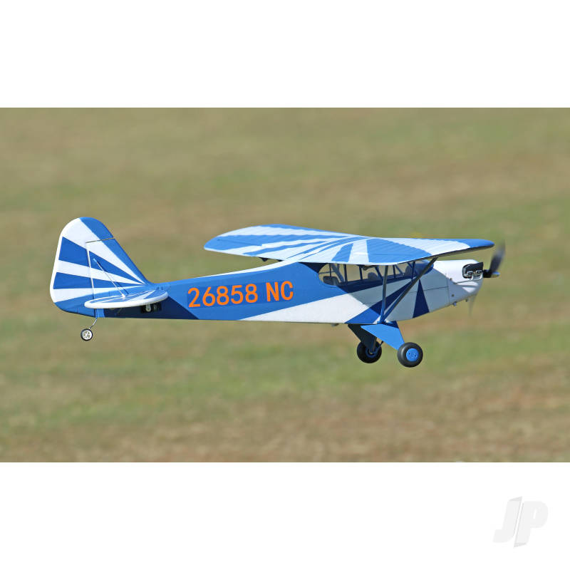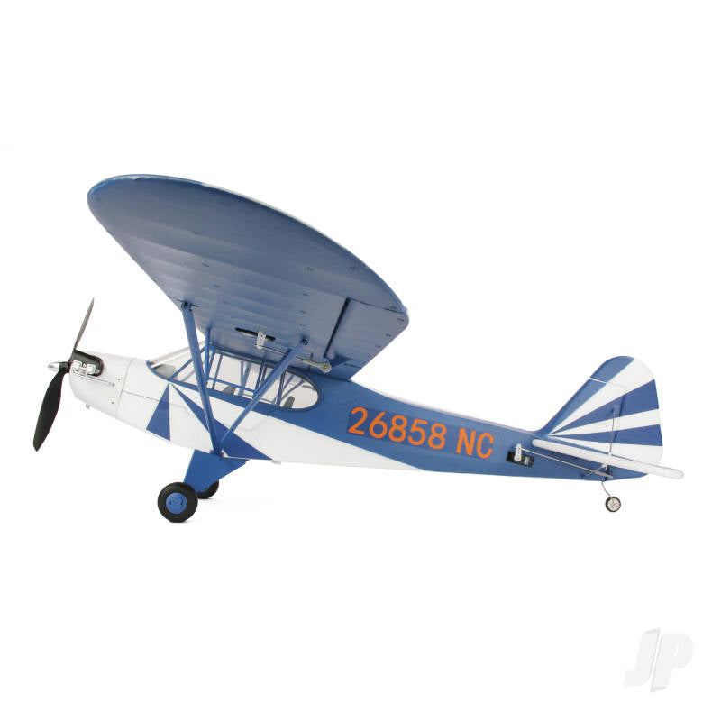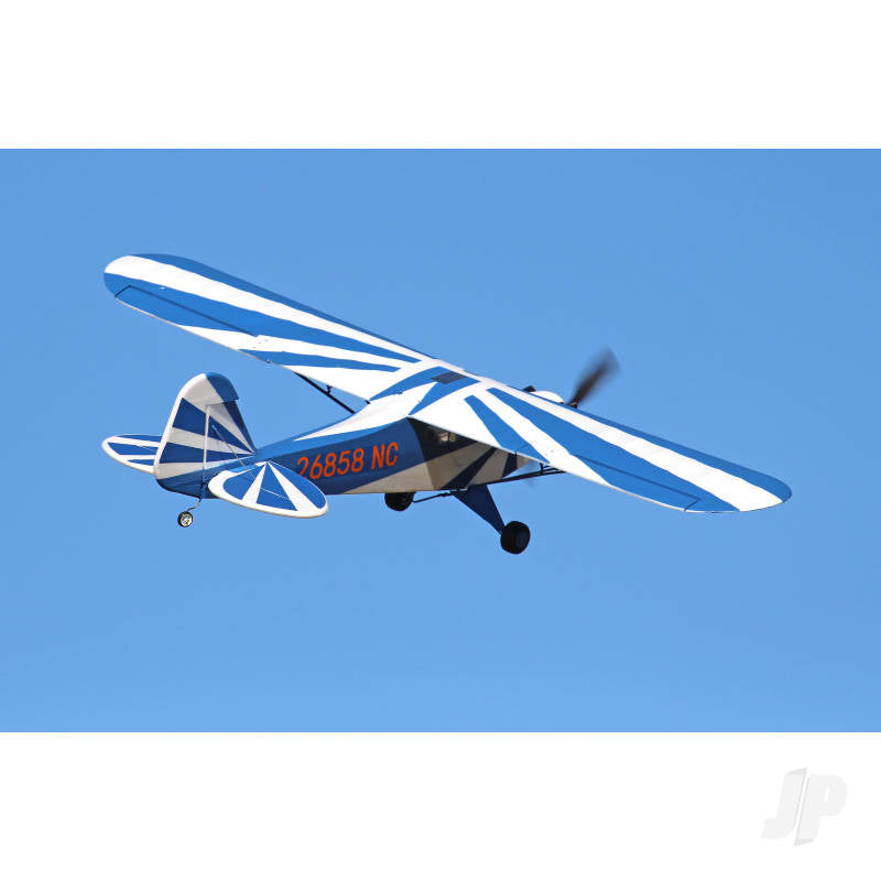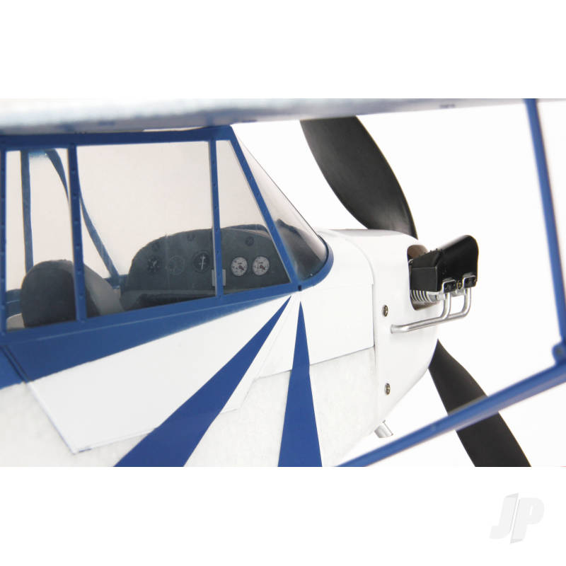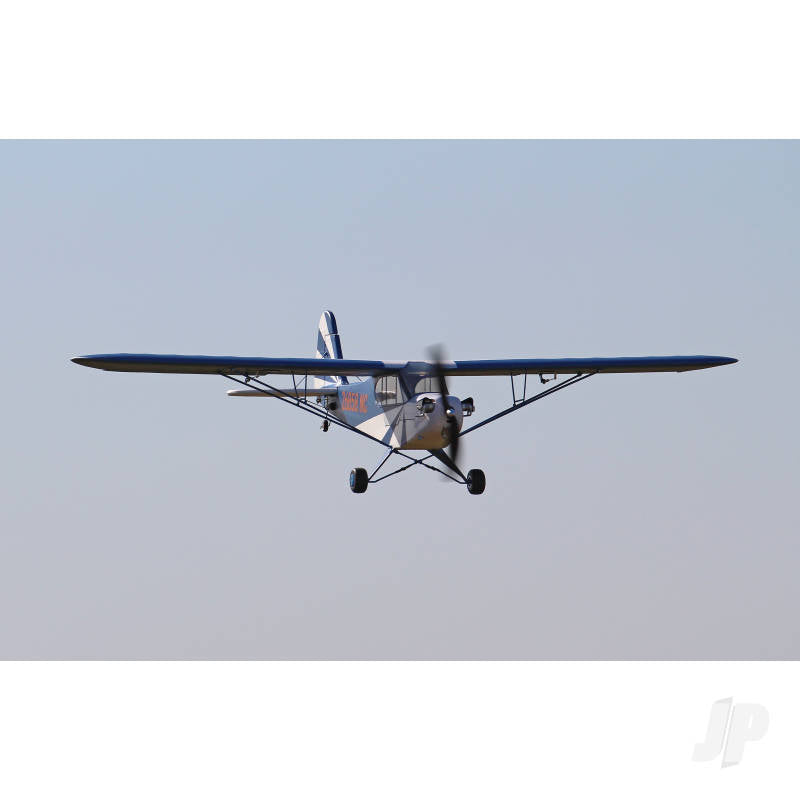 Talk about icons of the air; where civil light aircraft are concerned they don’t get more symbolic than Piper’s flat-4 powered small field runabout. Produced in huge numbers and seen in numerous colour schemes, not least standard Cub Yellow, this convenient size 1020mm span model is arguably one of the prettiest with its scale blue sunburst scheme. Those who appreciate fine detail will delight in the attention that’s been levelled on making this four-channel model look the part for not only does it feature a crisp Continental engine complete with cooling baffles, exhaust detail and oil cooler, there’s a neatly appointed cockpit, scale undercarriage and wheels, plus main struts, jury struts and even rivet detail.