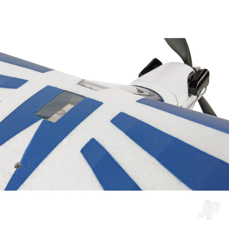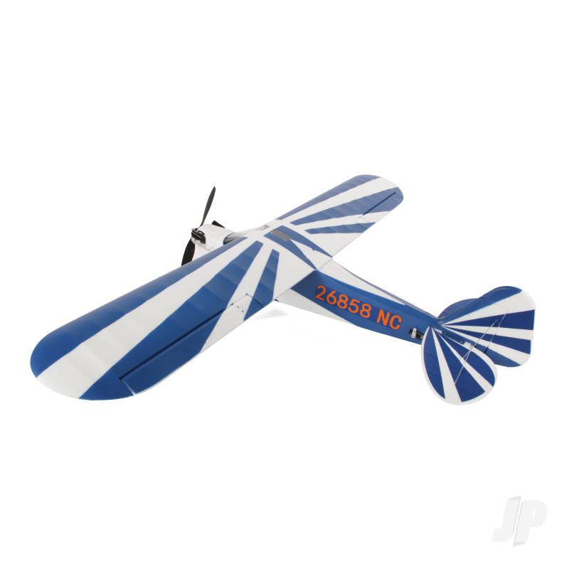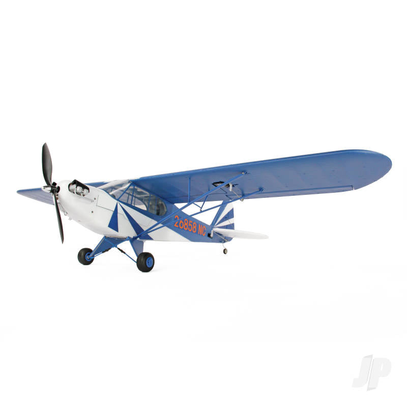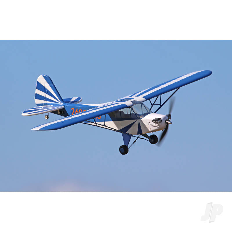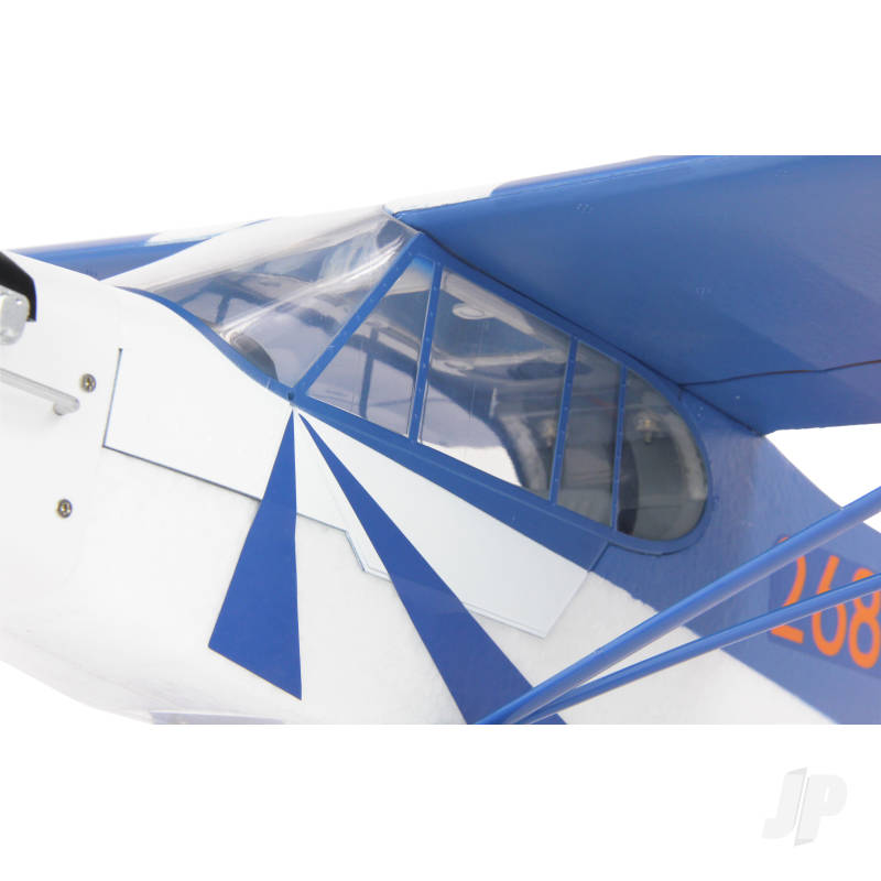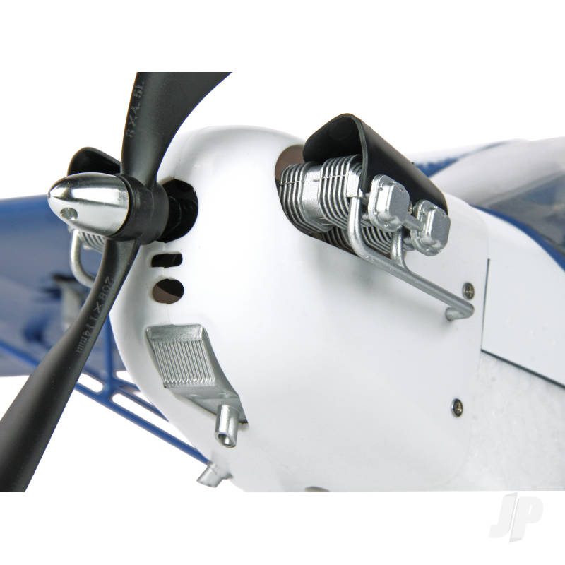 Talk about icons of the air; where civil light aircraft are concerned they don’t get more symbolic than Piper’s flat-4 powered small field runabout. Produced in huge numbers and seen in numerous colour schemes, not least standard Cub Yellow, this convenient size 1020mm span model is arguably one of the prettiest with its scale blue sunburst scheme. Those who appreciate fine detail will delight in the attention that’s been levelled on making this four-channel model look the part for not only does it feature a crisp Continental engine complete with cooling baffles, exhaust detail and oil cooler, there’s a neatly appointed cockpit, scale undercarriage and wheels, plus main struts, jury struts and even rivet detail.