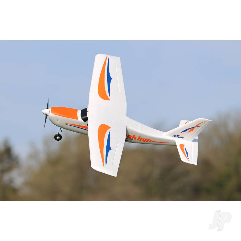 Eye-catching in its bright high-vis colour scheme, the Arrows Trekker not only looks right, it's been designed to fly right. Perfectly placed to take the complete beginner from tentative first hops to basic aerobatics and beyond, a close look at the airframe and well-appointed powertrain will find favour even with experienced pilots. From its classic Clark-Y high-lift wing and fully symmetrical stabiliser section, through the stable, high ground clearance, trike undercarriage layout, to the roomy fuselage and resilient EPO foam construction, this is an aeroplane that puts function and form on an equal footing, as a look inside will confirm. Here, the powerful 1200KV brushless outrunner and 20A ESC – coupled to a supplied 3S 1300mAh Li-Po – are perfectly suited to the ample ? x ?" propeller, resulting in enough power to tackle that crucial training function, yet perform aerobatics with ease. As a beginner, you'll immediately appreciate the Trekker's docile and forgiving flight envelope, while those with experience will delight in its versatility and outstanding performance. The Arrows Trekker is, quite simply, the perfect one-stop solution to grass-roots training and onward progression to basic aerobatics.