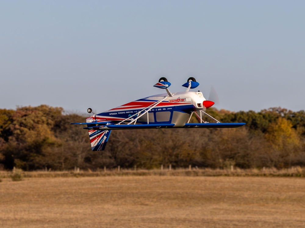Factory-finished in the classic yet modernized red, white, and blue trim scheme featured on the full-scale Decathlon RJ Gritter (RJG) – a lifelong full-scale and RC pilot – flies in airshows across the United States.