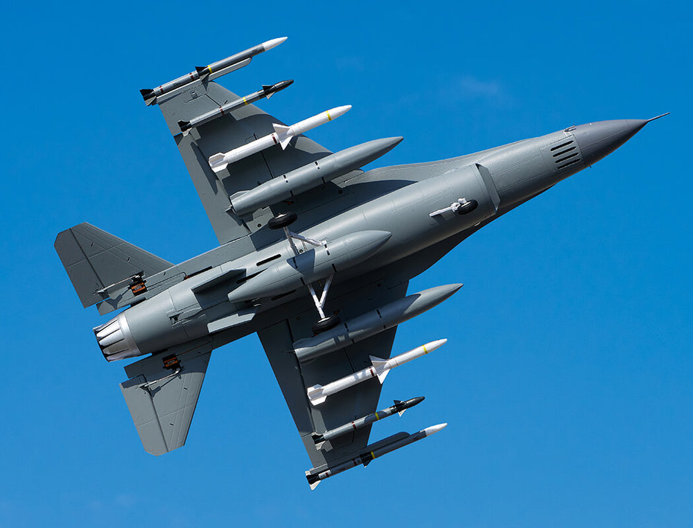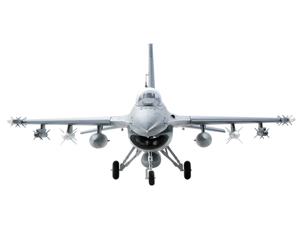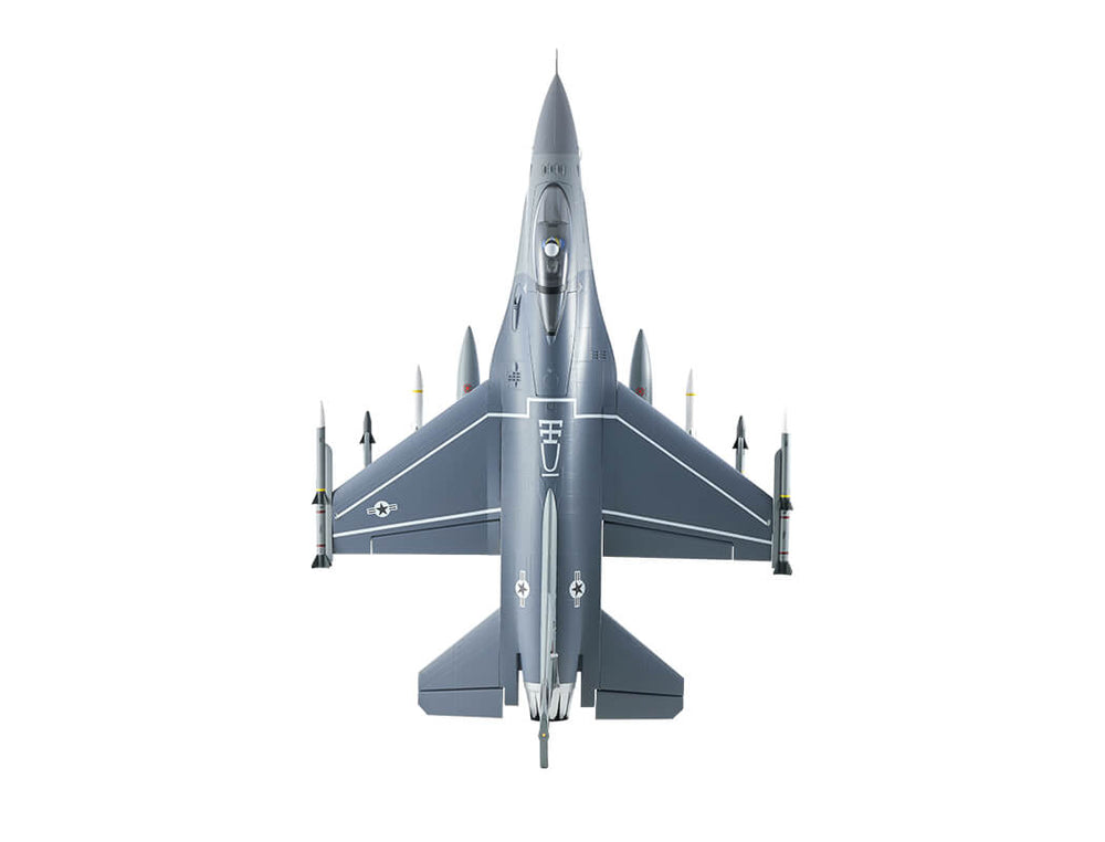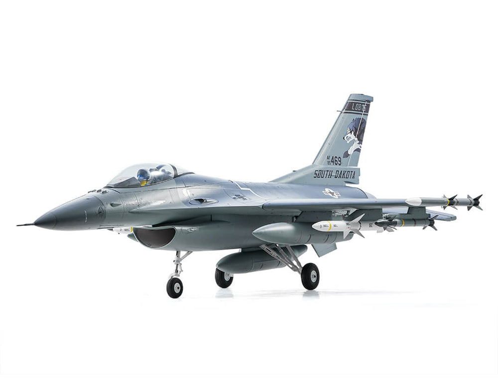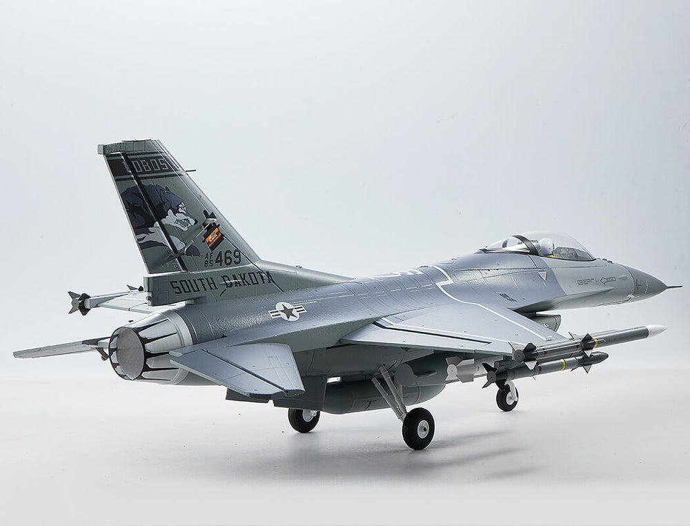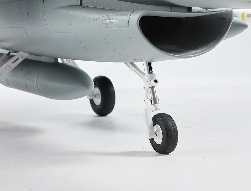 The newly moulded 64mm F16 not only boasts larger dimensions, sleeker contours, and more precise detailing but also brings a substantial improvement in realism. The front landing gear components are CNC machined with plastic bracket, delivering a high level of realism and excellent shock absorption. The rear landing gear is made with plastic-wrapped steel wire, enhancing realism without compromising strength. Navigation lights have been added to the wings, tail, and air intake to enhance the ambiance during flight. They are meticulously designed to follow the real aircraft lighting effect, providing a more authentic appearance in low light conditions. In addition to the existing aileron, nose wheel steering, and elevator controls, rudder control has also been added, significantly improving the aircraft’s manoeuvrability and enabling the faithful replication of most fighter jet manoeuvrers. The fuselage, wings, horizontal tail, and vertical tail all feature embedded reinforcement tubes to prevent bending or deformation during aggressive flight manoeuvrers. The battlefield gray paint scheme and the Thunderbirds airshow paint scheme are available options.