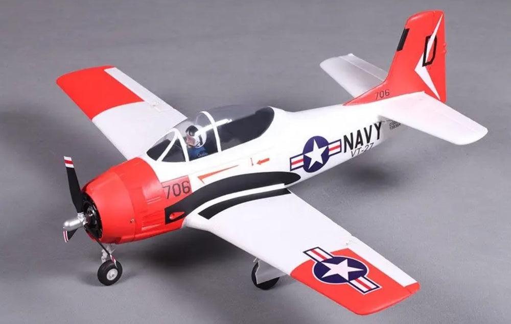 Many scale features including three blade painted propeller, steerable nose gear, hand painted pilot figures, and US Navy trainer graphics