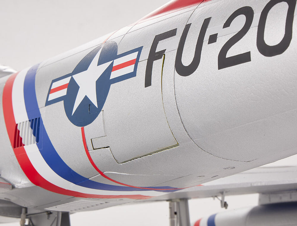 Building upon their extensive experience in developing remote-controlled model fighter aircraft, FMS has made significant efforts to faithfully replicate the legendary and classic F-86 "Sabre" with the product standard of "perfect appearance, excellent performance." The model is filled with numerous realistic details, such as operable landing-gear doors, retractable CNC-machined landing gear, movable airbrakes, wing navigation lights (red on the left, green on the right), jet nozzle navigation lights (one red, one white), and landing lights (white). The static model-level exterior details have also been meticulously addressed, including fuel tanks, cockpit interior (moulded plastic parts), and antennas. It's worth mentioning that the interior plastic parts of the cockpit and the airbrakes have both undergone an antiquing process, creating a bridge to the past.