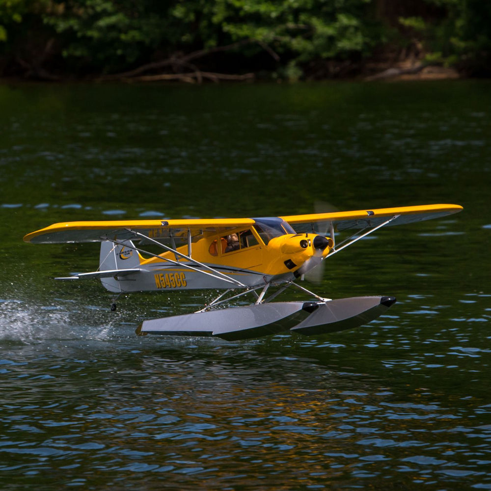 The Hangar 9® Carbon Cub 15cc ARF brings the heritage and versatility of the full-scale airplane to life with a modern all-wood model that combines classic looks with a higher performance spirit. Featuring a 90-inch wingspan, this large model delivers the experience of giant scale, yet is practical enough to fly every day. The two-piece wing allows for convenient transportation and the quick-connect struts make assembly simple. Scale detail like cockpit doors, interior features, landing lights and a scale spinner mean that this Carbon Cub model will easily turn heads at the field. A light wing loading plus functional flaps help you perform impressive short takeoff and landings. Like the full-size, shock-absorbing landing gear take most of the bounce out of grass strips. With the optional 1/5-scale float set (sold separately), you can enjoy the same adventure-driven performance at the local lake.