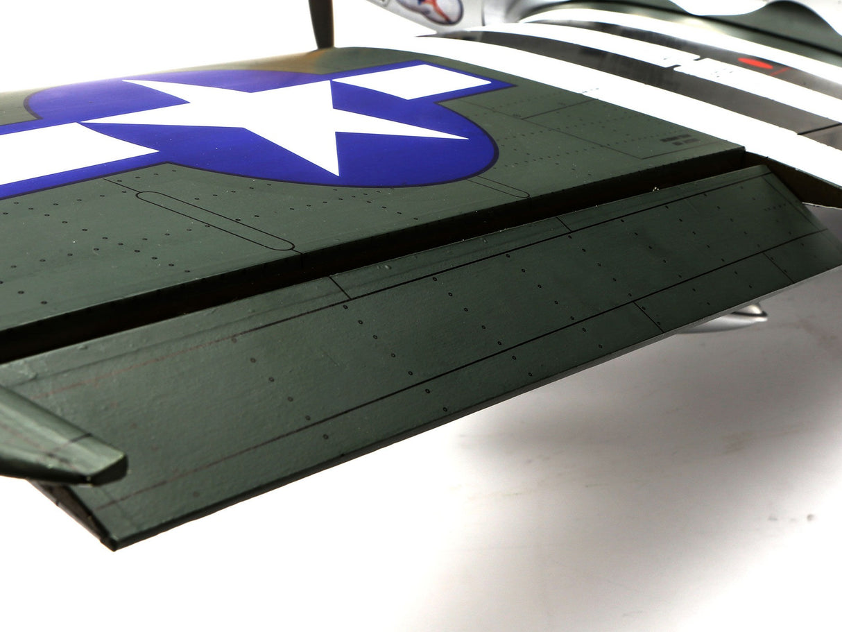 Leading the list of stunning details is the expertly applied, satin-finish covering of the sleek airframe. The lightweight material captures scale features like panel lines, rivets, stenciling and distinct colors for a brilliant appearance that's also durable. Bringing its authenticity even further is a well-appointed cockpit with a 3D instrument panel, an intricately painted pilot figure and faceted utility compartment. The updated cowling with a more scale-like shape features a matching finish with inlets and exhaust, plus a matching spinner. Optional-use wing tanks can be attached on the included wing pylons, or removed to improve high-speed maneuverability. Functional shock-absorbing gear struts include scale-style axles with room for the large wheels that make flying from grass easier.