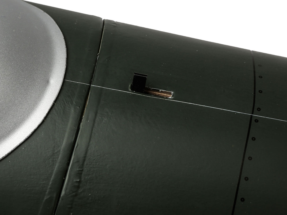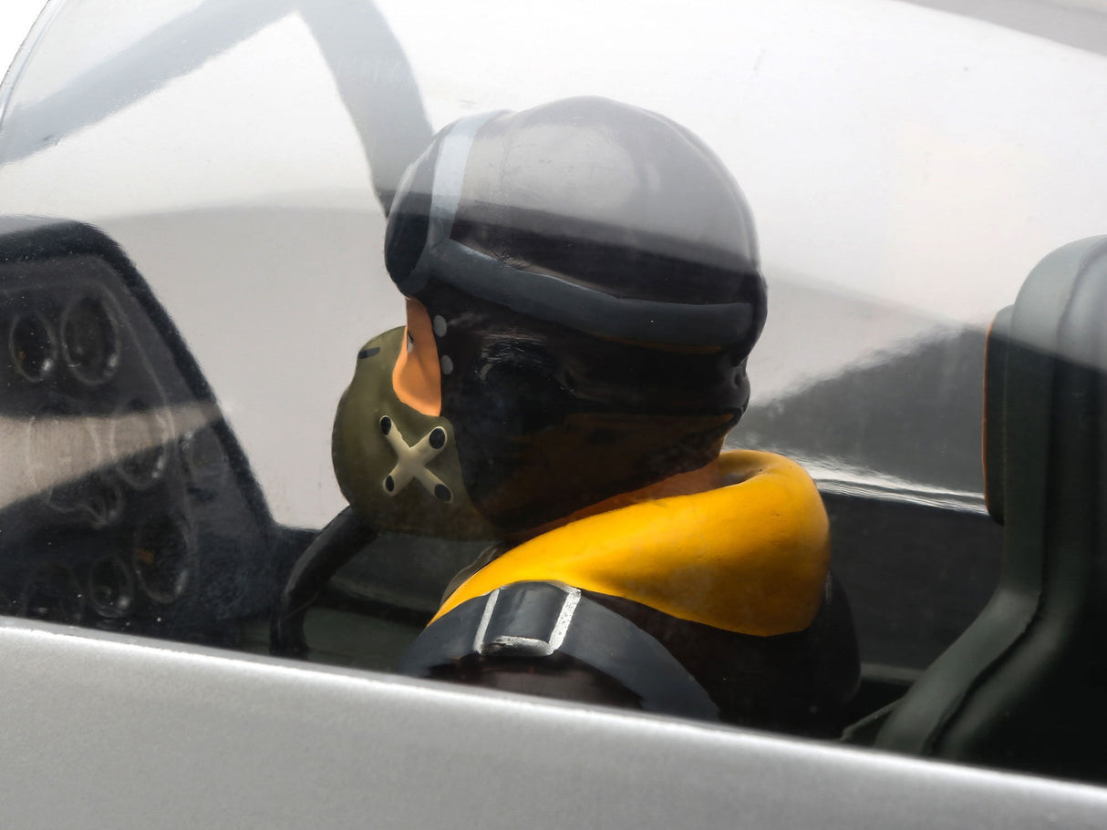 Beyond the factory applied satin-finish printed covering, other iconic details include airfoil-shaped tail surfaces, realistic engine exhaust, wing guns, gear doors, optional-use drop tanks, radio antenna, a 3D instrument panel and a painted pilot figure.