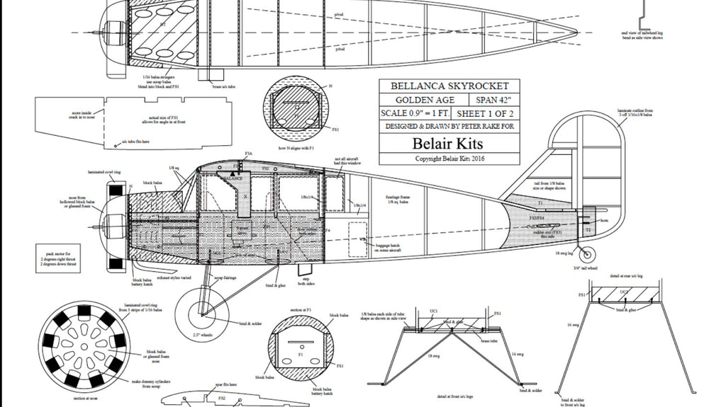 From the Golden Era of flight, comes the elegant Bellanca Skyrocket. With a wingspan of 42 inches, the design is traditional all wood construction and modern CAD design features. ADDITIONAL SHEET & STRIP PACK NOW INCLUDED. A full size multi-sheet plan is included and the laser cut parts set includes all the balsa and plywood parts required to build the basic airframe, such as fuselage sides with spar slots and wing position holes laser cut for accuracy, formers, bulkheads, cowl components, wing ribs, shaped spars, tip shapes, trailing edges, struts plus many smaller items. Specifications Scale 0.9" to 1ft, 42 inch wingspan for 400 size electric brushless motors and 2 cell lipo batteries. Rudder, elevator and motor function. |