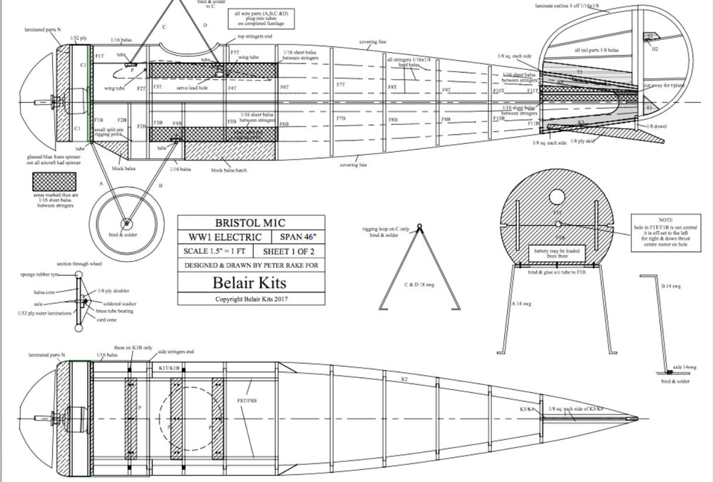Bristol M1C Another iconic model from WW1 designed for Belair by Peter Rake. Modelled at 1.5":1', this 46 inch model suits 480 size brushless (150w) setups.
