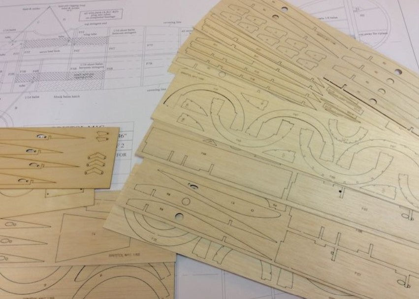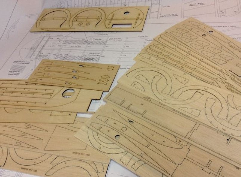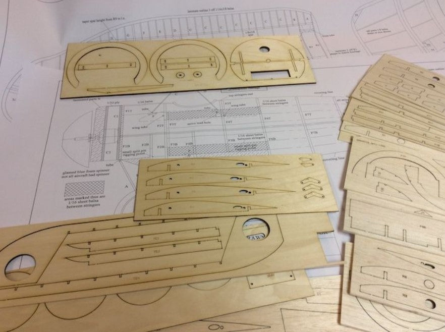 The Belair Parts set is full of intricate laser cut parts in balsa and plywood, including fuselage parts, bulkhead, formers, cowl parts, wing ribs, shaped trailing edges with rib slots cut, tail parts, servo plates, tail skid, fuselage crutch parts.