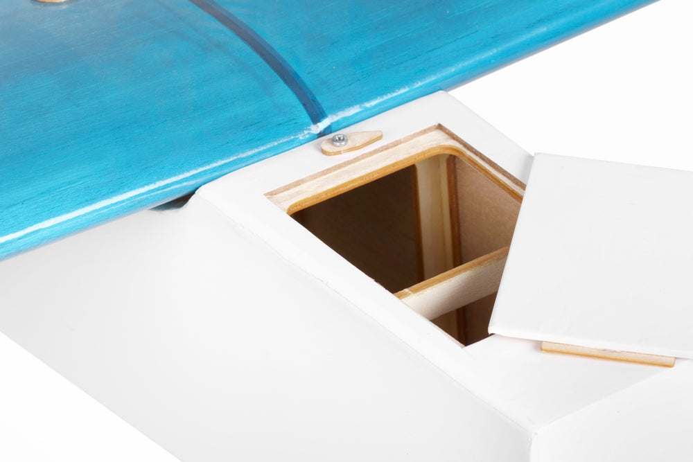 The fuselage is a classic balsa/liteply work; the bottom balsa sheet with laser cut notches creates a “spine“ that will accept all the formers, braces and sides exactly where they are required to be. The plywood firewall is ready for your glow engine radial mount as well as your brushless motor. The elevator and rudder servo tray is located under the wing. The removable top nose hatch is here to give easy access to the fuel tank or battery compartment.