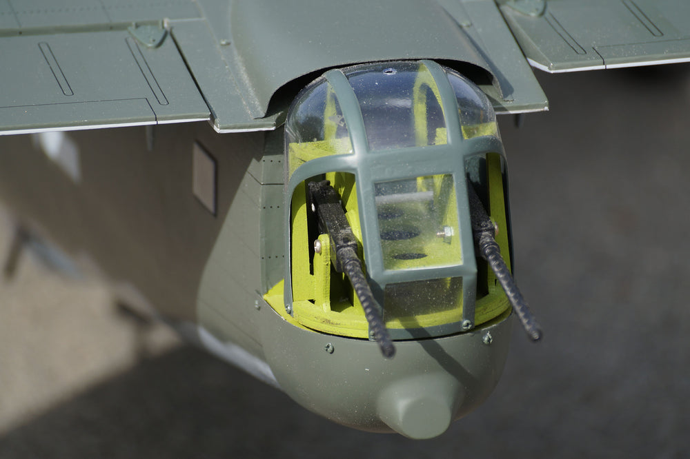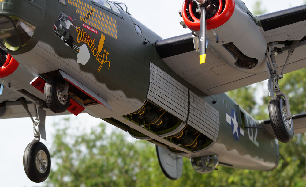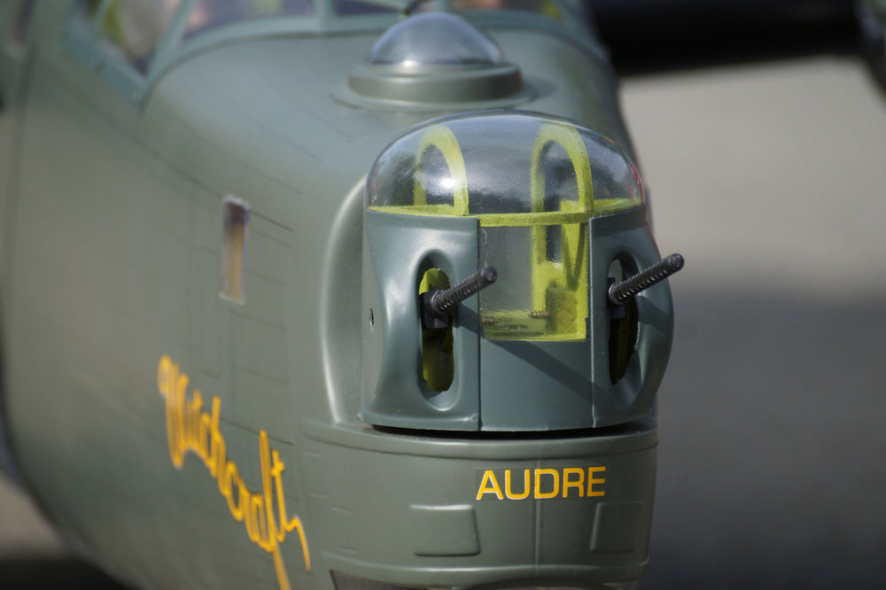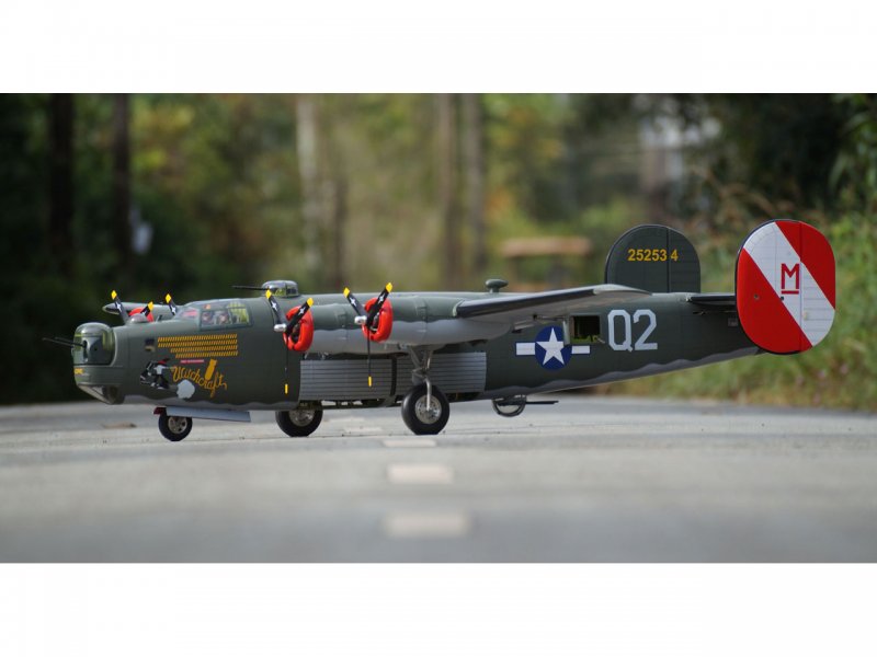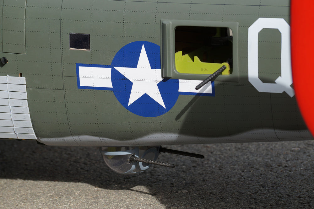 This VQ ARF's reproduction B-24 Liberator R/C aircraft is designed for modern electric motor systems with big battery hatch on the top of fuselage . At its core, this model has a very scale outline and features many details not usually found on an ARF wood model.