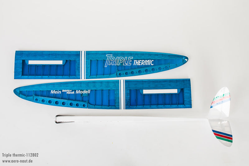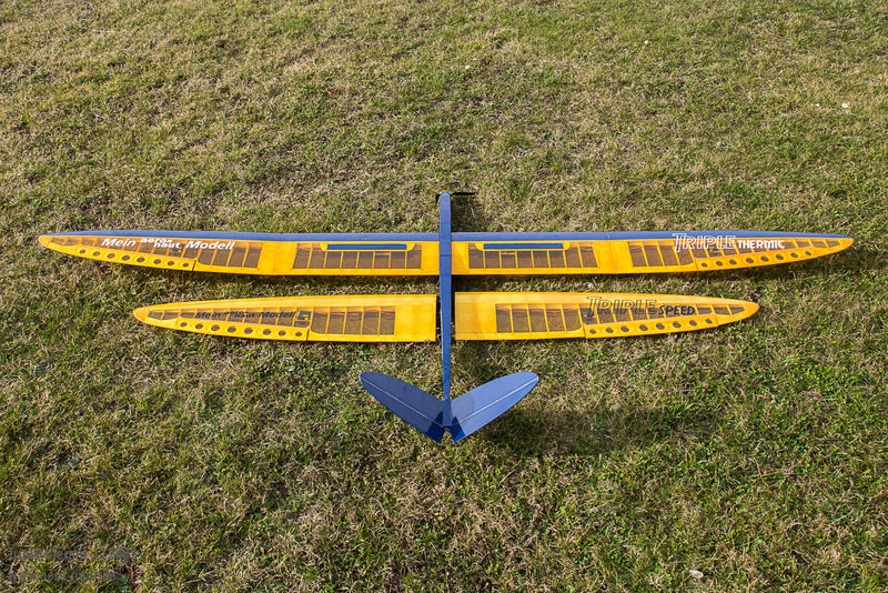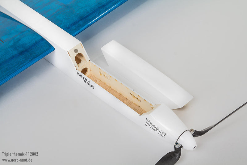 Common to both fuselages is the removable canopy with magnetic lock and a fuselage cover on the underside, behind which the servos for the V-tail are hidden. All models are built entirely in wood and thus follow the aero-naut proven principle of model construction. The hull is constructed from poplar plywood and balsa. The innovative plug-in system enables quick and distortion-free assembly. The V-tail is also put together from laser-cut parts and glued to an extra slipway supplied. The wings are built in rib construction, have continuous pine spars and a box with grooves, so that they can be set up quickly and easily on any level building board. The trailing edge paneling is also grooved so that nothing can be done wrong with the position of the ribs.