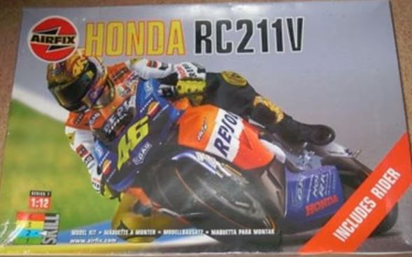 AIRFIX 1/12 scale plastic kit #07480-factory sealed-skill level 2. REPSOL HONDA RC211V 500cc AS RIDDEN BY #46 VALENTINO ROSSI GRAND PRIX ROAD RACE BIKE. Details include: nicely detailed motorcycle kit, detailed rims and black vinyl tires, detailed frame and engine, rider figure included, screen printed authentic sponsor decals, 74 pieces with stand, molded in color or white, measures appx. 7" long x 4" high.