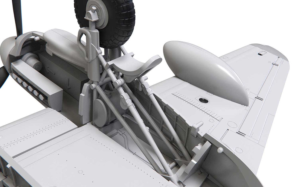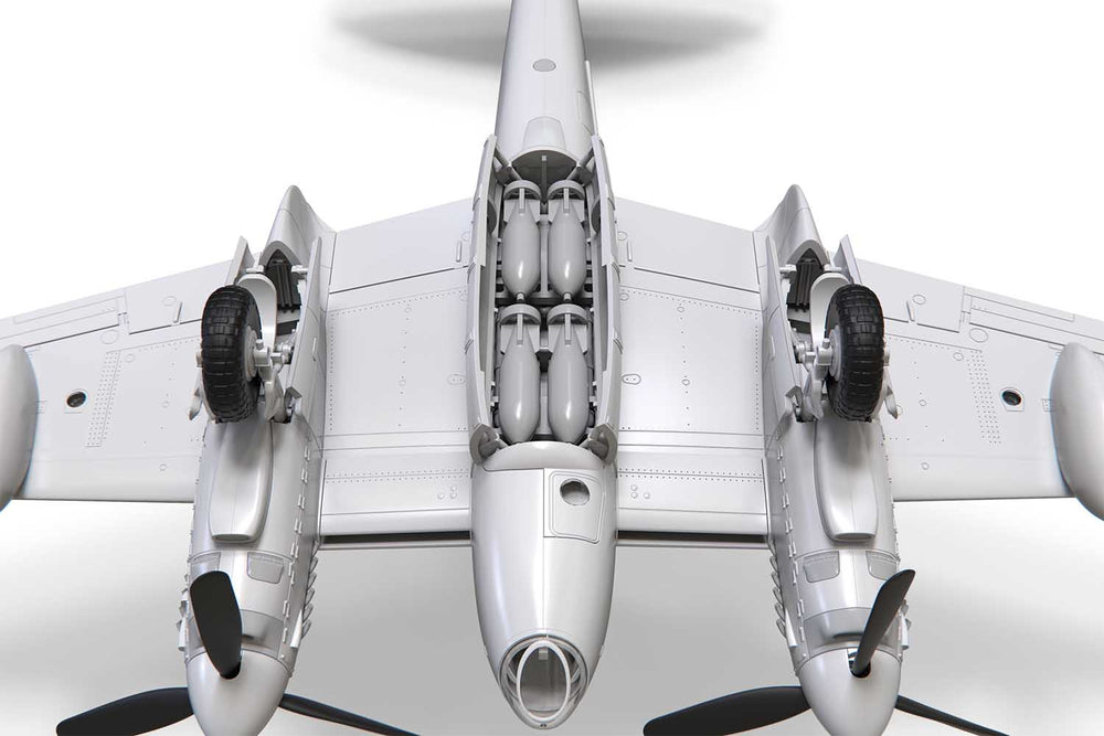 Combining the power of these fearsome weapons with the legendary speed and bombing accuracy associated with Mosquito operations allowed Bomber Command to keep the pressure on the enemy throughout the latter stages of WWII. Interestingly, these huge bombs were exactly four times the weight of the original bomb load this exceptional aircraft was designed to carry, which is testament to the strength of the Mosquito's construction techniques. Optimised for high altitude operations, this final major bomber variant of the Mosquito could be powered by several different 'seventy series' versions of the Rolls Royce Merlin engine, in addition to incorporating a modified wing, which could now accept either a 50 or 100 gallon paper drop-tank on either side and up to four externally mounted 500lb bombs, further enhancing the strategic capabilities of this superb aircraft.