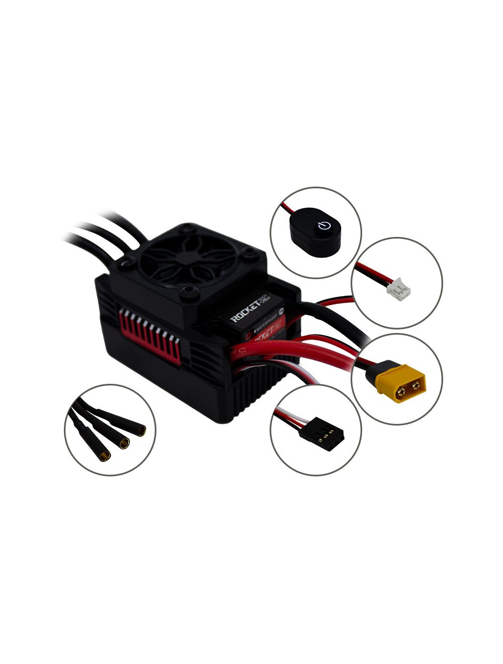 The 60A ESC comes equipped with a 5.8V/5A BEC output, perfectly suitable for high torque and high voltage servos, and is housed in a sturdy, waterproof, and dustproof plastic casing, making it ideal for all-weather racing. Specifically designed for RC cars, it provides outstanding start-up, acceleration, and linearity, along with superior resistance to current and effective heat dissipation. This ESC features various protection systems, including low voltage cut-off for LiPo or NiMH batteries, overheat protection, and motor block protection. Additionally, it incorporates a removable and replaceable cooling fan to improve heat management, and its design includes extra protection for efficient heat dissipation.