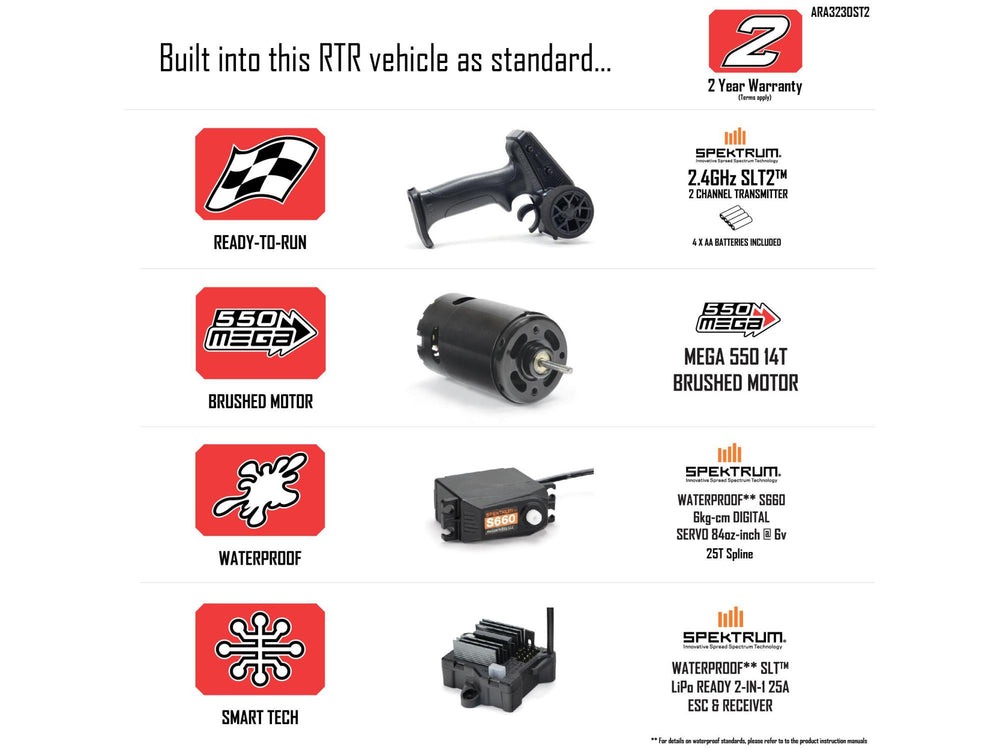 If you're new to RC, the Spektrum SLT2 2-channel radio helps you learn control skills safely by limiting maximum speed to 50% or 75% until you're ready to unleash it all. Bash without worry in wet conditions — the Spektrum 2-in-1 25A ESC/receiver unit and high-torque Spektrum S660 steering servo are both waterproof. (For details on waterproof standards, refer to the product instruction manual.)
