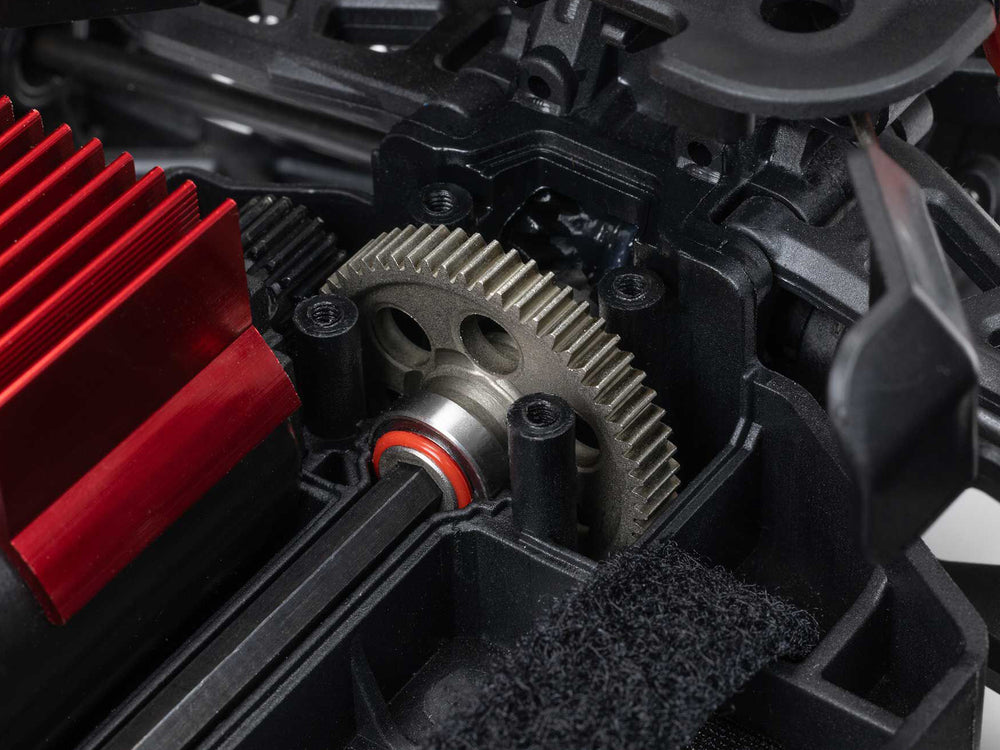The high-traction 4-wheel drive transmission features rugged metal gears. It carries power from the installed MEGA 380 brushed motor to the wheels through an enclosed drivetrain. The entyre power system is well-protected for dependable performance on all terrain.