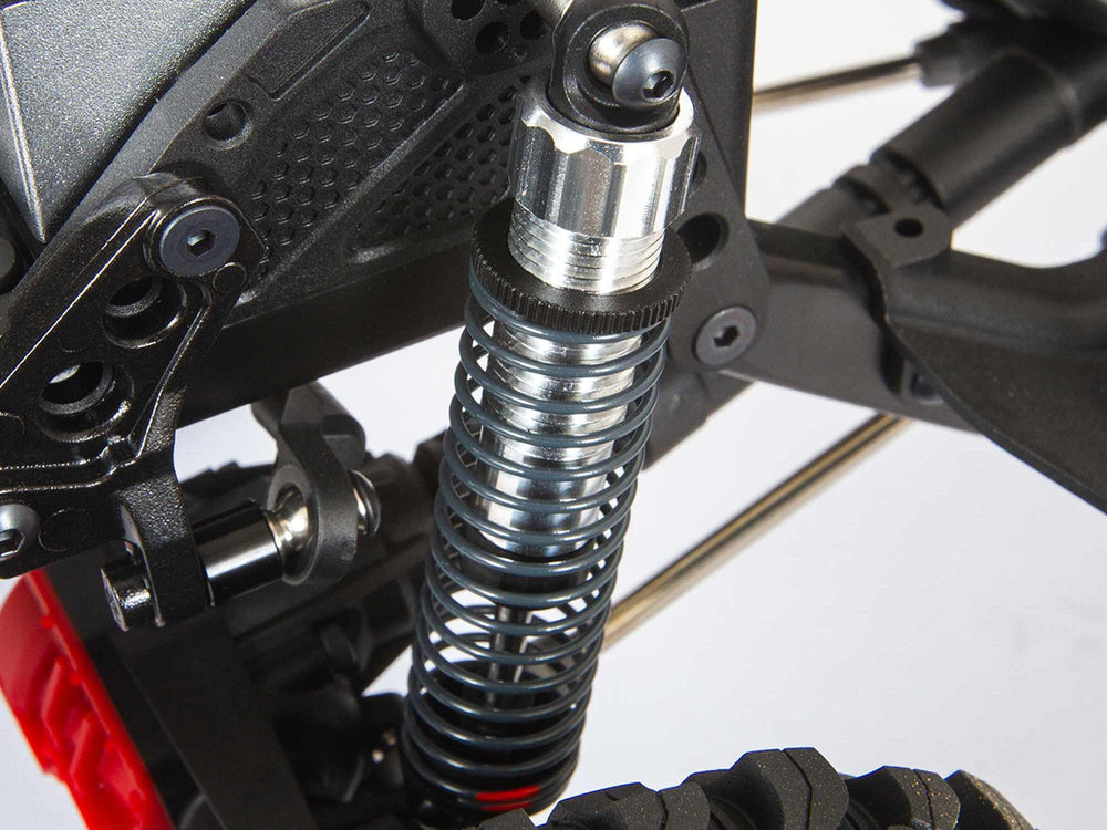 The oil-filled shocks have aluminium threaded bodies and a single coilover spring. The shocks are tunable for achieving the best dampening rate. Their increased bore size also creates more fluid volume for better performance.