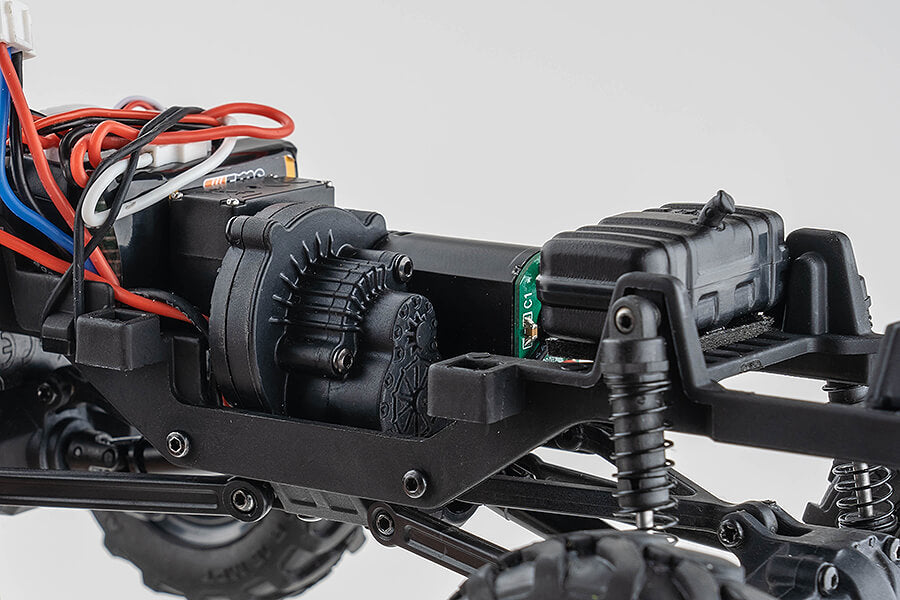 The crawlersare generally equipped with front and rear straight axles to simulate the locked state of the real car differential to improve off-road passing ability. The FCX24 is equipped with a straight axle by default, but the planetary gear differential can also be replaced with high-viscosity silicone oil to simulate the driving effect of an LSD limited-slip differential. After installing the differential, the ultimate climbing ability will be reduced, but a smaller turning radius and a more stable high-speed driving quality can be obtained. Simply put, the straight axle is suitable for extreme climbing, and the limited-slip differential is suitable for high-speed off-road. The choice is yours.