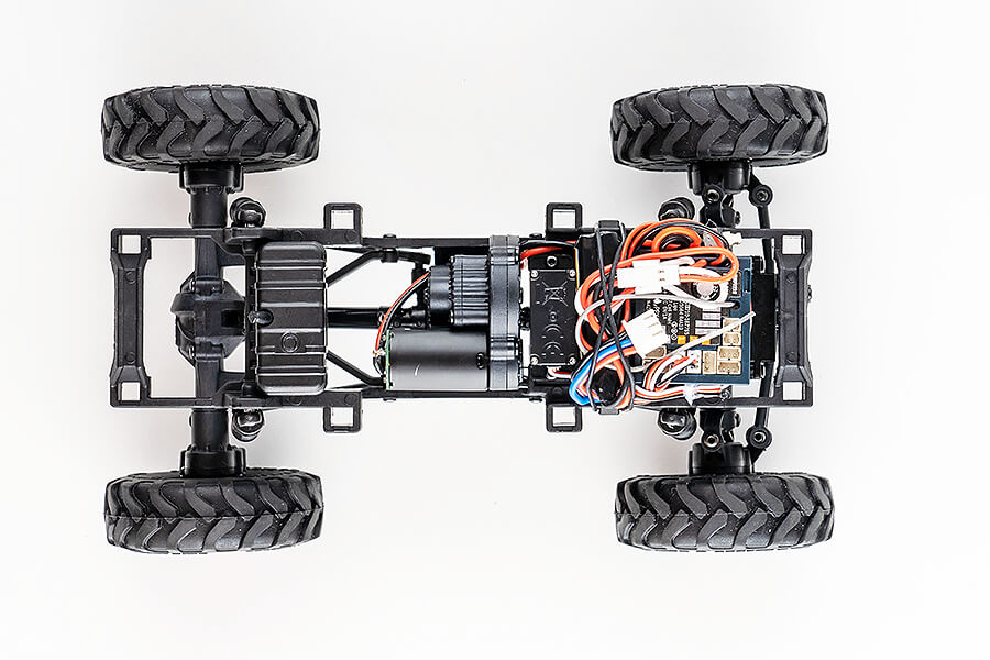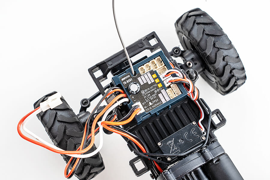 2.4G 4-channel digital proportional remote control system, in addition to normal driving and steering control, the CH3 is used to control shifting, and the CH4 is reserved for players’ imagination expansion. It is also equipped with a lighting control module, and the headlights can be switched between high and low beams. In addition, interfaces for taillights and turn lights are reserved for players to modify.