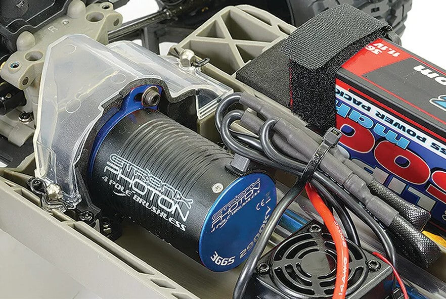 Etronix 2500kv brushless motor, Hobbywing brushless speed control and Voltz 3S 3500mAh LiPo battery provide speed and power.