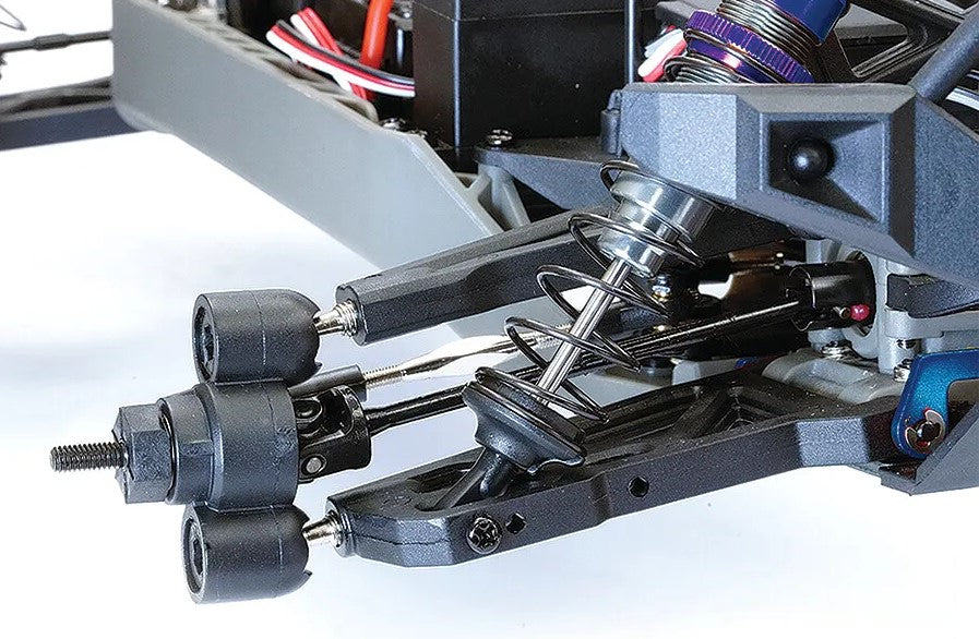 Oil filled aluminium shock absorbers along with a raised high clearance main chassis, with aluminium front and rear skid plates glide over most terrain effortlessly. Should you take a tumble, shock absorbing bumpers and moulded body roof and tail skid bar rails help protect from heavy damage when possible.