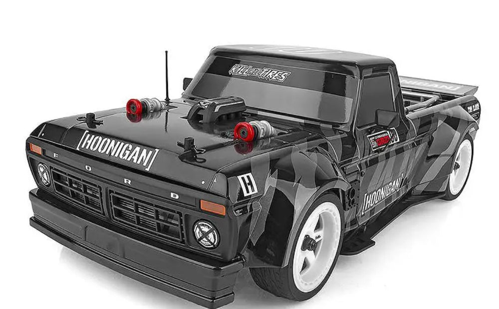 The Apex2 chassis has been updated from our previous version with the latest features in on road racing. A front and rear independent suspension with threaded oil-filled shocks and active rear toe give the Apex2 the ultimate in handling on uneven tarmac. This makes it a perfect platform for the Hoonitruck and tire-shredding action!