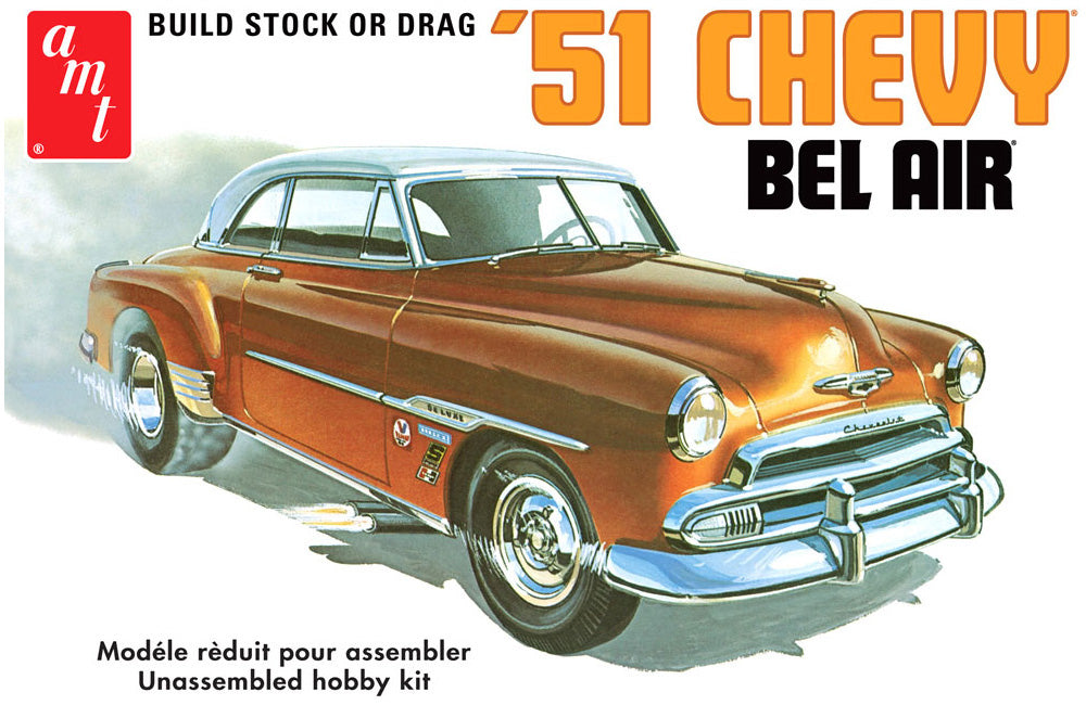 AMT presents the '51 Chevy Bel Air as a 2-in-1 Retro Deluxe release. This fun to assemble kit comes complete with all the parts needed to build factory stock or burly drag gasser versions