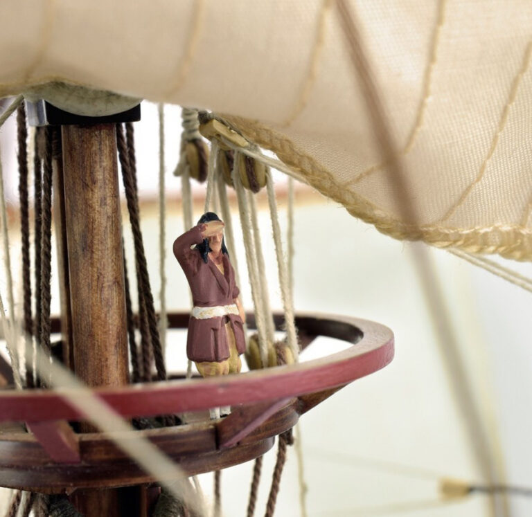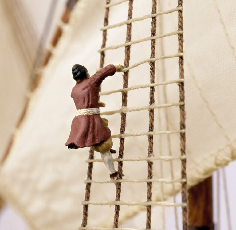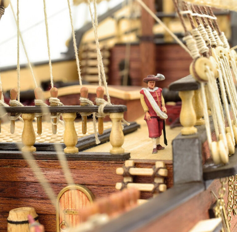 The San Francisco II wooden galleon model includes a wooden exhibition base with a metal name plate for the Spanish ship. In addition, five metal figures to be painted totally free.