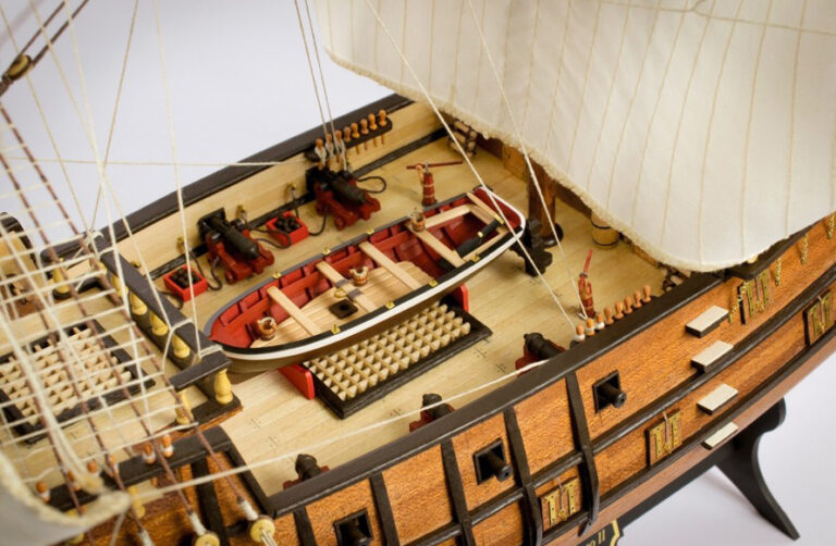 The kit contents with wooden galleon model of San Francisco II (22452-N) are qualified with a simple adjective: excellent. It has a laser-cut wooden structure, birch strips and sapele veneer. It also offers brass photo-etched decoration to increase realism. Without forgetting its cotton sails -and threads- sewn by hand and flags prepared to be placed.