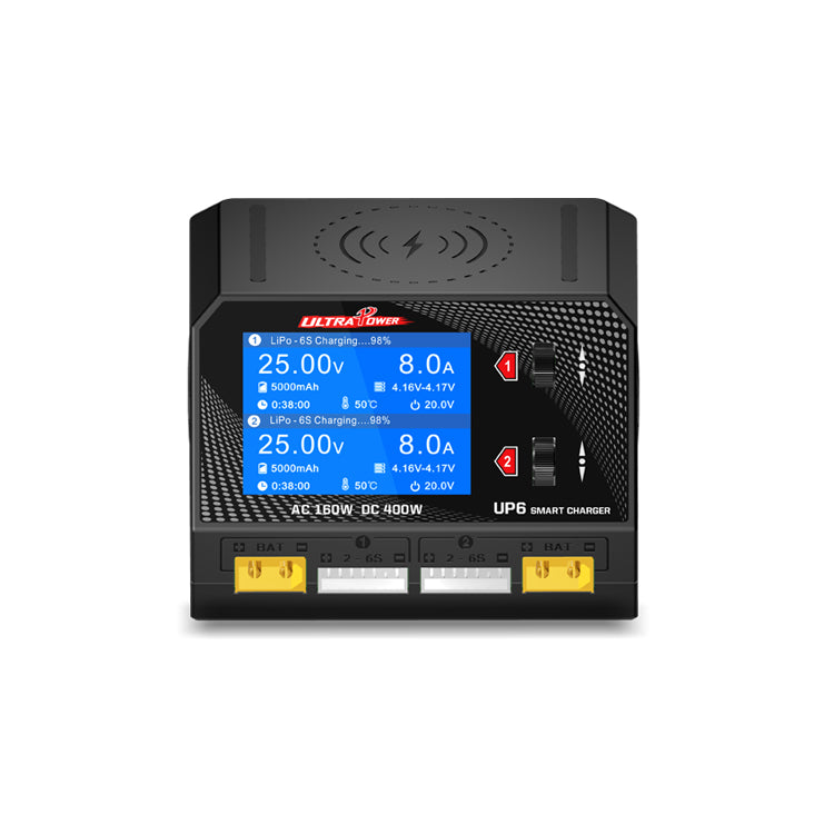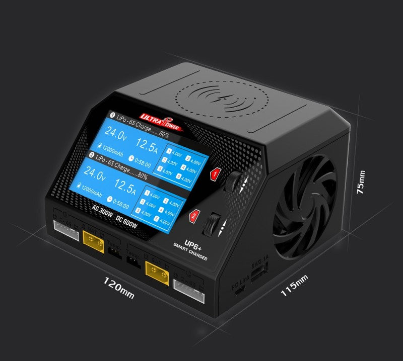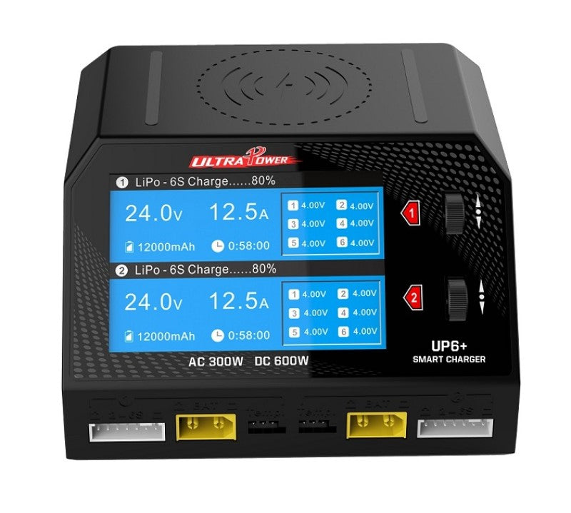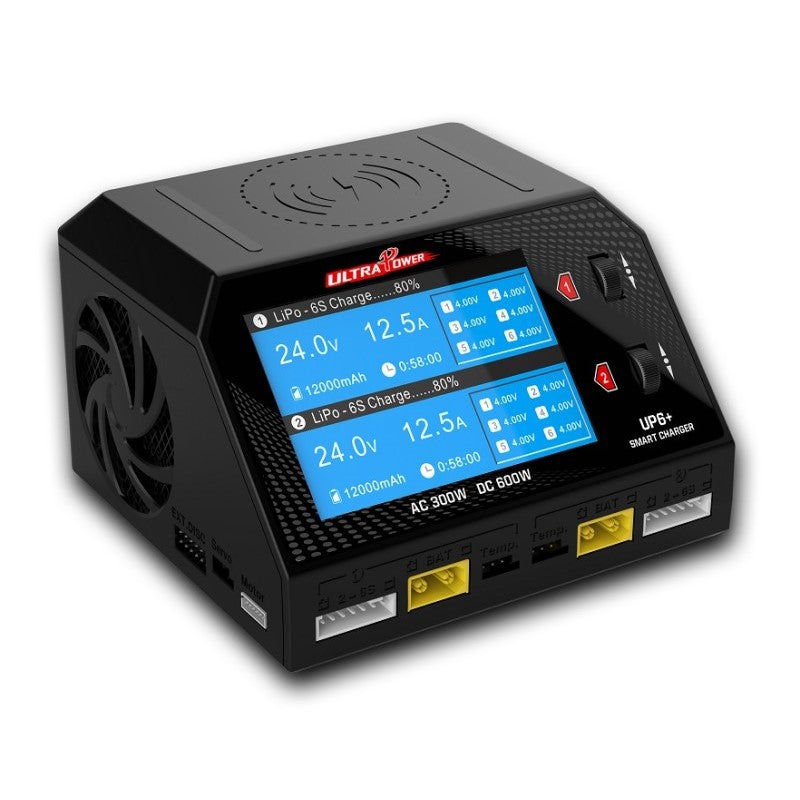 The UP6 is a powerful smart charger designed specifically for the RC hobby. All relevant charging data can be seen clearly, thanks to the 3.5" LCD display, and also features Wireless charging for mobile devices (includes all popular models including Apple iPhone XS, 11, 11Pro, Samsung Galaxy S9, S10, Note 10, Huawei and more.