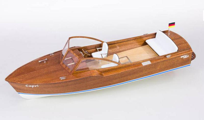 The Capri is a semi-scale model boat exploiting our proven hard-chine hull design. The shape of the hull is borrowed from our Victoria, which guarantees excellent handling on the water, including high-speed turning ability. The boat is assembled in a Depron jig from birch and mahogany plywood. The wooden parts are all laser-cut, and are reinforced with spruce strips. The model can be built very quickly since the parts are such a precise fit.