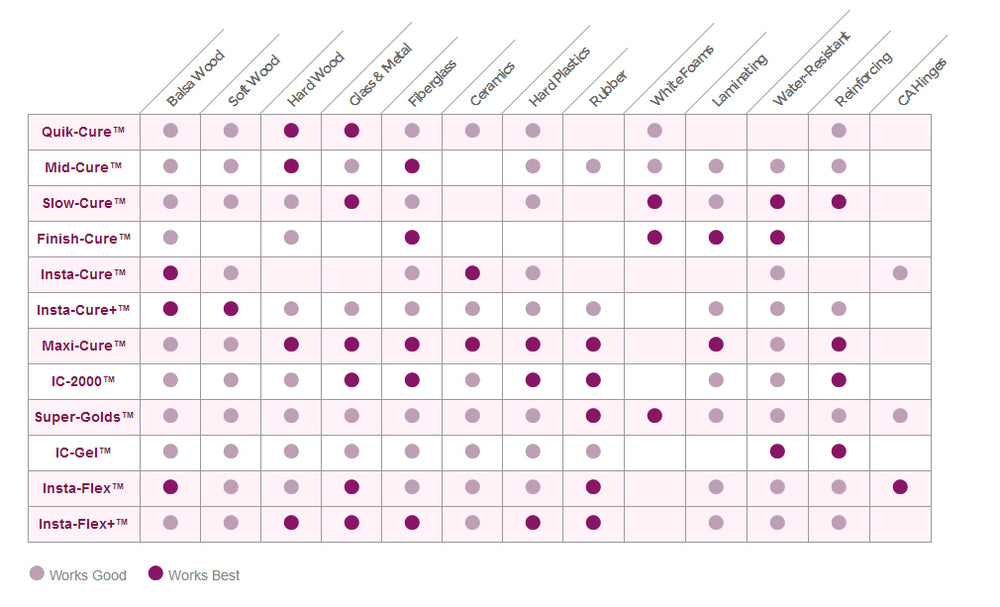 Insta-Cure+™ is a higher viscosity CA for loose fitting joints in which the adhesive must bridge gaps. Normally, the thicker CA is applied to one surface and then the parts are held tightly together for about 5 to 15 seconds. For large surface areas, including those with close fitting joints such as laminations, INSTA-CURE+ ™ should also be used. To prevent premature curing, don’t spread the glue into a thin film. Lay down a serpentine bead with about 1" separations on one surface, then assemble the parts, letting the pressure spread the CA out.
