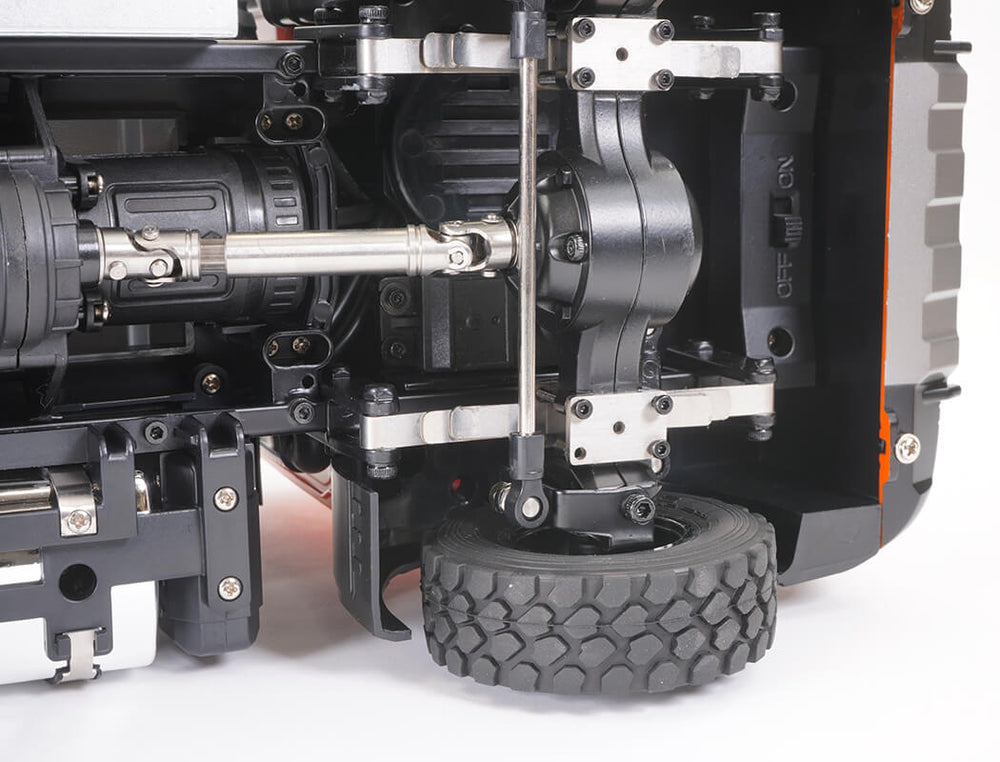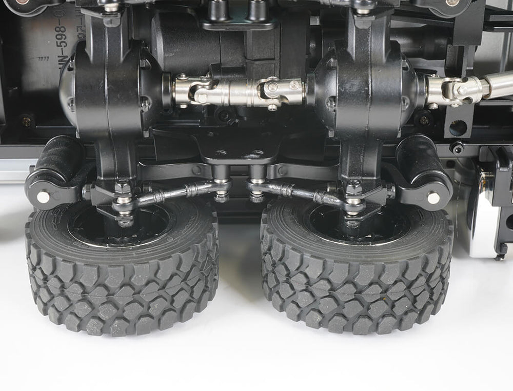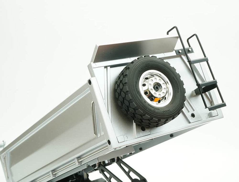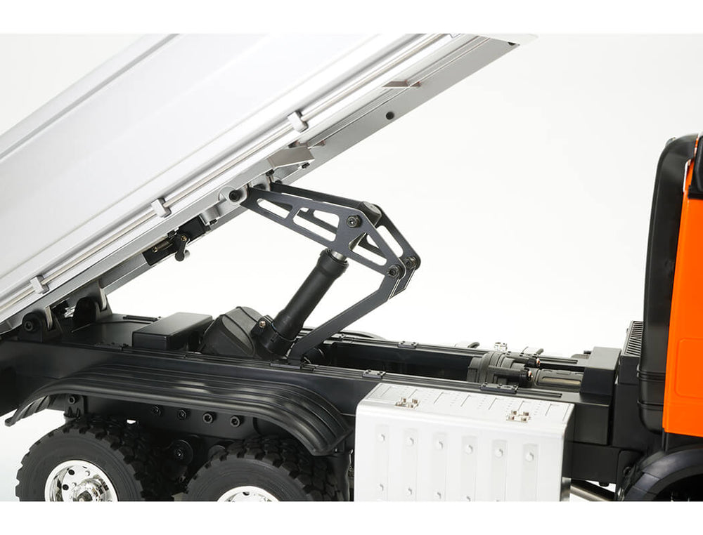 With 14 working functions you can carry out tasks with ease and precision. Realistic tilting truck bed with sounds and lights. Detailled interior truck cab. 6-wheel shaft drive transmission with leaf front spring and rocker arm rear suspension.