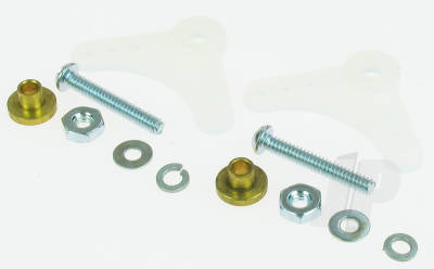 Set includes (2) 90 degree bellcranks with (2) bushings, (2) 4-40 x 3/4" (19 mm) screws, (2) lock washers, and (2) hex nuts.