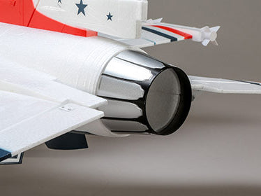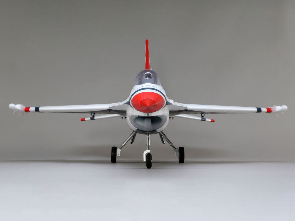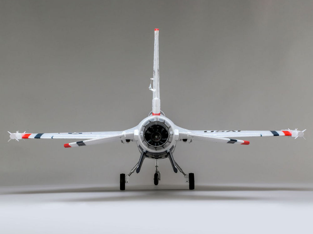 The E-flite F-16 Thunderbirds 70mm EDF jet is a replica of the iconic aircraft flown by the U.S. Air Force Thunderbirds. Like the full-scale airshow thriller, this F-16 has an incredibly wide flight performance envelope-from slow and stable high-alpha flight to amazing high-speed and vertical capabilities. At its core is a 6S-compatible brushless motor and a 70-amp ESC that are matched to a 12-blade fan to deliver an abundance of speed, thrust and a turbine-like sound. Factory-installed electric retracts with shock-absorbing struts make it possible to take off and land on a wider variety of surfaces-including grass-while keeping ground handling smooth and delivering a realistic jet experience. The composite reinforced EPO airframe is lightweight yet strong, and the digital, metal-geared servos plus ball-link equipped linkages provide precise control. And it all combines to deliver one of the easiest to fly yet highest-performance and most capable F-16 models ever!
