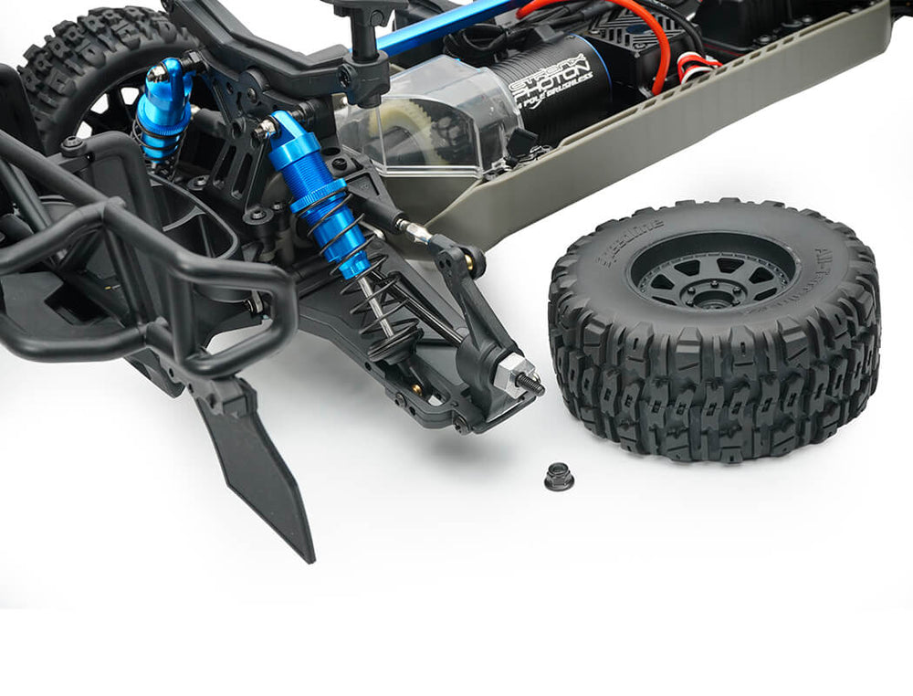 Aggressive block-pattern soft race tyres mounted on black 8-spoke wheels ensure maximum grip and authentic Trophy Truck stance.