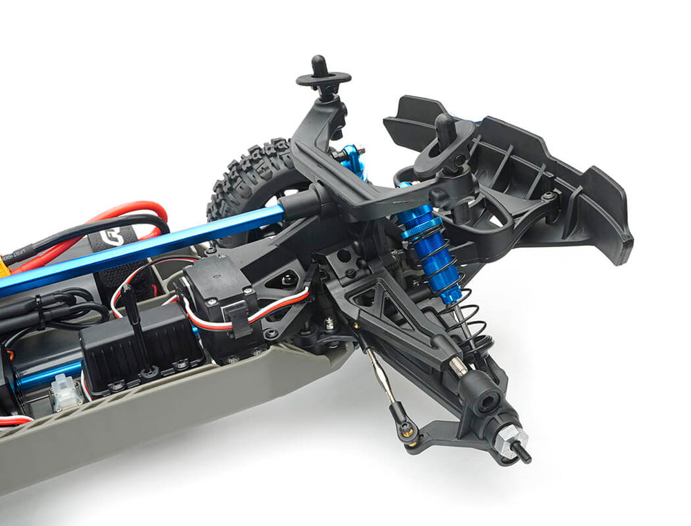 The Apache’s high ground clearance moulded tub chassis is now reinforced front-to-rear with an aluminium T-brace for near-zero chassis flex, while aluminium skid plates and updated moulded bumpers add extra protection for hard off-road running. Long-travel suspension has been strengthened with revised arms and a new rear upper link, supported by blue anodised aluminium oil-filled shocks at each corner.