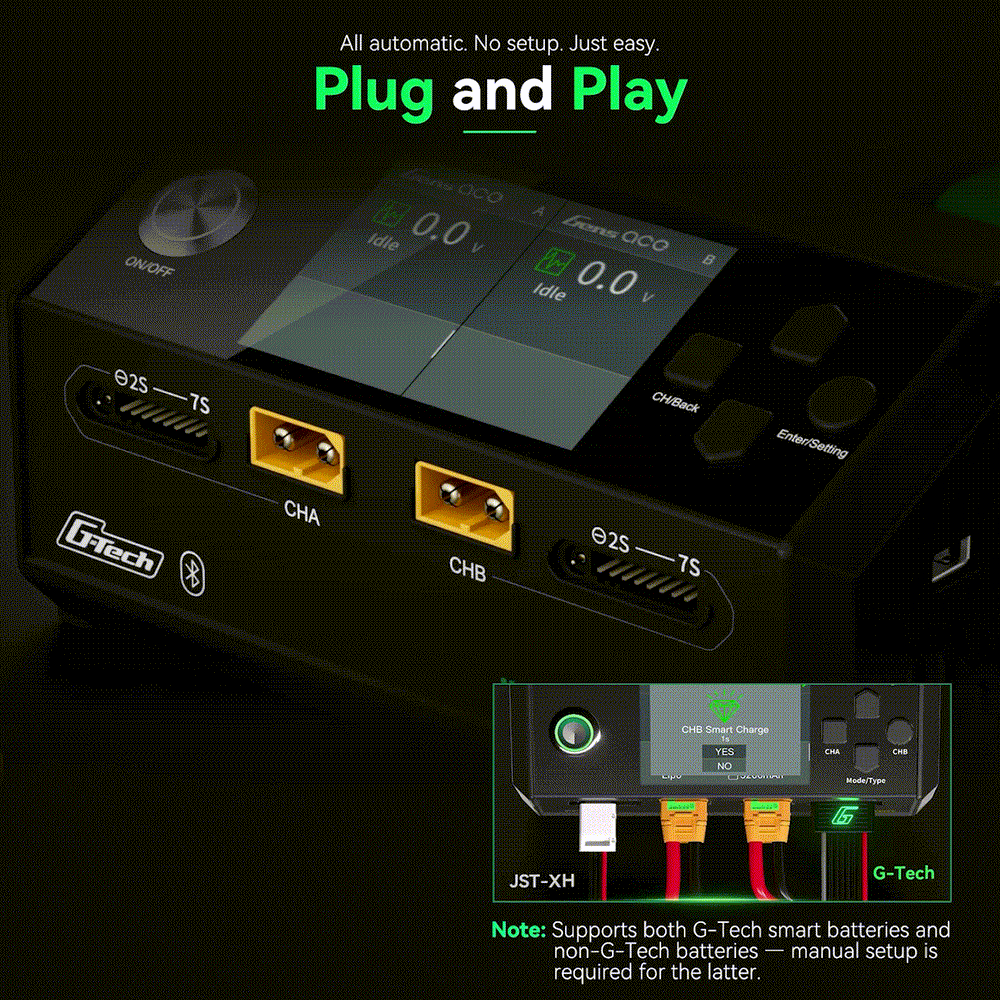 The Gens Ace iMars D1000 Plus is a new dual-channel smart charger based on the D1000. It keeps the core features of the G-Tech system and adds Bluetooth remote control. RC enthusiasts can now use the Gens Ace app to manage and view more real-time data and historical records, making the experience simpler, more efficient, and safer. Spec Data Weight 1.7Kg Height 95mm Length 186mm Width 174mm