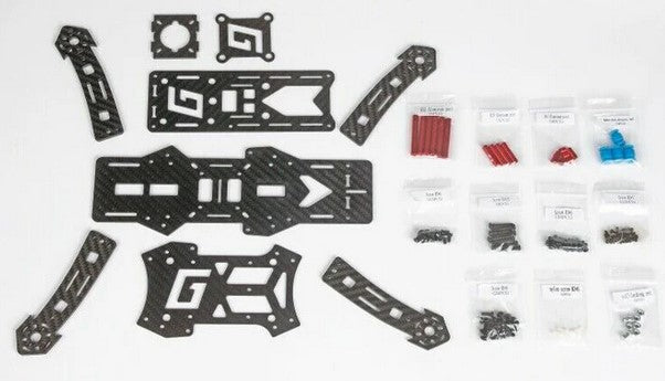 The frame of the ALPHA 250 is completely CF, which is extremely rigid and insensitive. The 2 bottom plates, which gives a streamlined look, allows the installation of 4 Brushless ESC, (not included)and stowing over long cable.