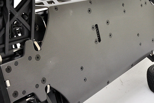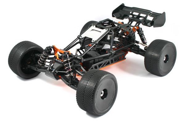 As an electric rolling chassis you are free to decide what electronic package is best for you and your budget. Underneath the roll cage you will find a chassis that can accommodate most of todays current crop of high performance brushless motors, speed controllers and LiPo batteries. The moulded battery tray features three quick release velcro straps perfect for 2S, 3S and 4S packs. Colour coded, anodised aluminium chassisparts complement the roll cage assembly for an eye catching look. The newly designed front C-Hub suspension assembly, 3-differential driveline and 17mm big bore shocks soak up all that is in their path.