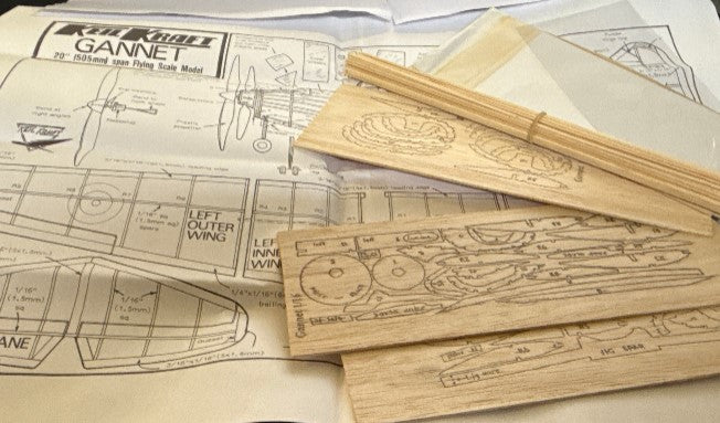 Printed parts on balsa sheet, strip wood, Clear sheet for making canopy and tissue (due to age there is a small faded area.
