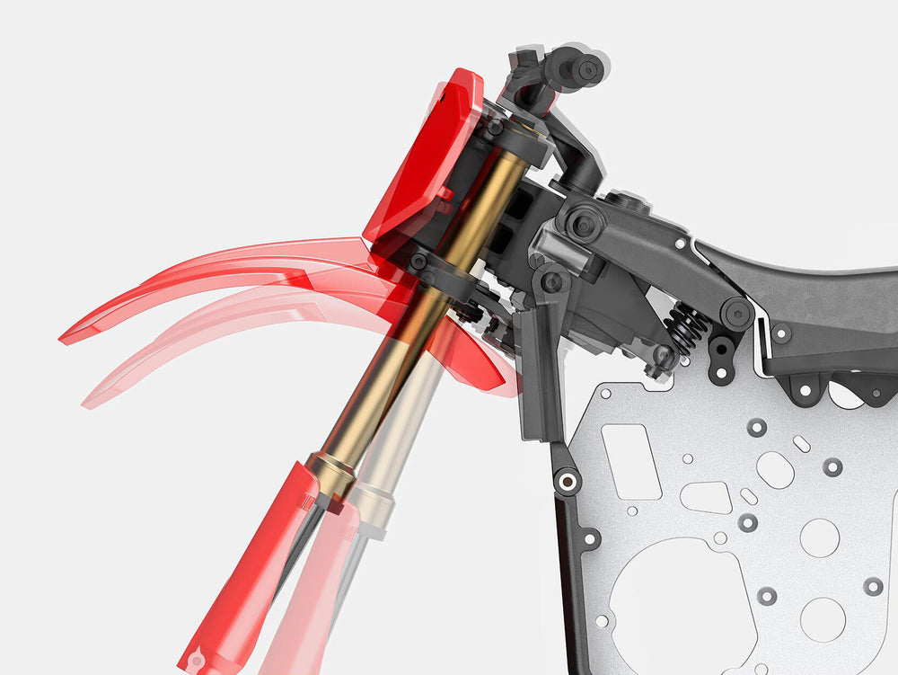 There's nothing better than sending a huge triple, but what happens if you come up short? Bending a fork leg or tube was not an option, so the Promoto-MX product development team found a solution. The front crash structure is rigid during normal running, but compresses until the front Tyre bottoms into the chassis frame to absorb those massive front impacts. That protects the front fork tubes from bending, keeping them safe and true.