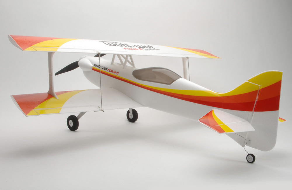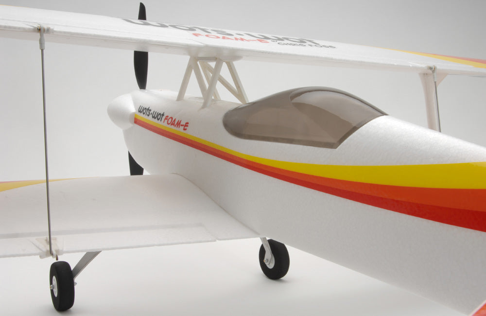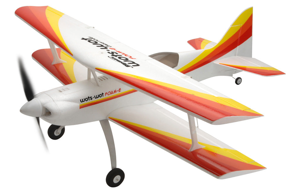 In the air biplanes are associated with slow scale flight but not the WotsWot, thanks to four large ailerons the roll rate is fast and authoritive and the short moment of the design gives great elevator and rudder power. The Wots Wot really excels during slow speed flight and can be really docile with low rates on. Up the rates and open the throttle for flicks, spins and knife edge loops are more! The stall is benign and thanks to the biplane configuration it really slows down nicely for landing.