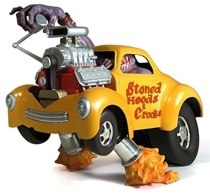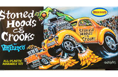 This is the second Moebius Models kit based on the monster art of Von Franco, a self-taught American artist associated with the Lowbrow art movement and Kustom Kulture. Von Franco's skill at drawing hot rod and monster art follows in the art style of Ed "Big Daddy" Roth and Von Dutch. The inspiration for this kit is Von Franco's caricature monster painting Stoned Hoods & Crooks. The challenge of this kit is not in the build, but in painting the model in the cartoonish style of the box art. If you ever wanted to paint a fluorescent orange model piloted by a lime green monster driver with bloodshot eyes, then this is your kit!